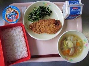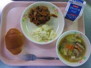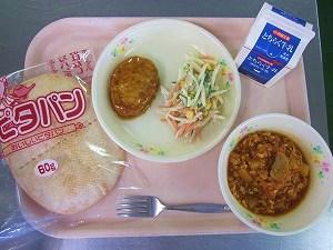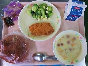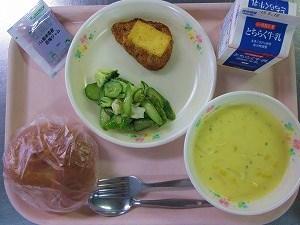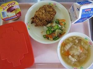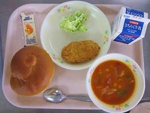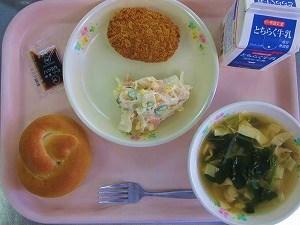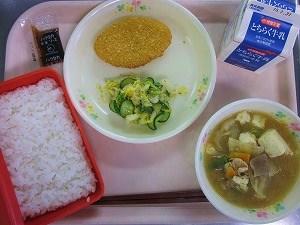 「ご飯 牛乳 野菜コロッケ 白菜のピリッと漬け 豚汁」です。