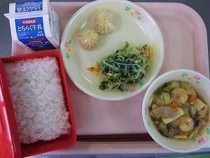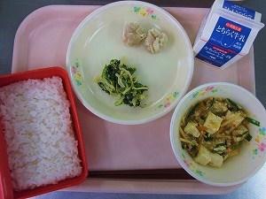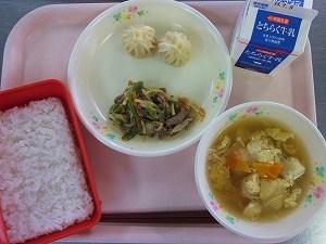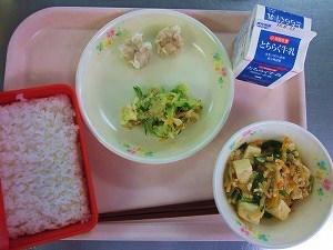 「ご飯 牛乳 ポークシューマイ 春雨サラダ 麻婆豆腐」です。