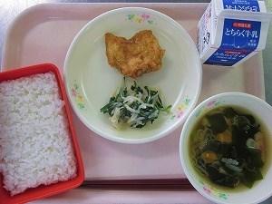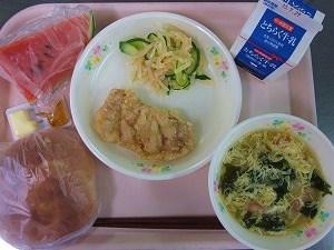 「米粉パン メープルマーガリン 牛乳 から揚げ キムチ和え 卵とわかめのスープ スイカ」
