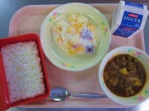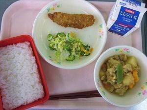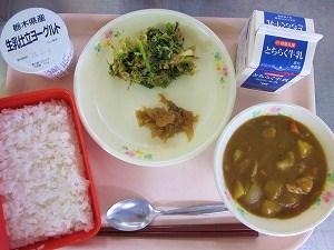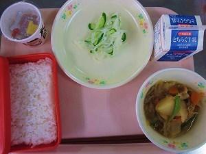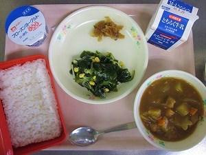 「ご飯 牛乳 チキンカレー 福神漬け 海草サラダ フローズンヨーグルト」です。