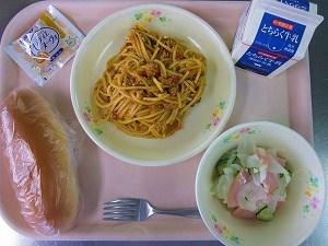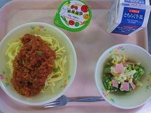 「ソフト麺 牛乳 ミートソース ゆで野菜サラダ 給食週間フルーツゼリー」です。