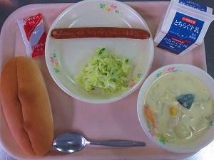 「ご飯 牛乳 とろほっけ冬霞焼き 五目ひじき ニラ玉汁 チーズドッグ」です。