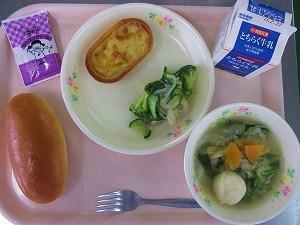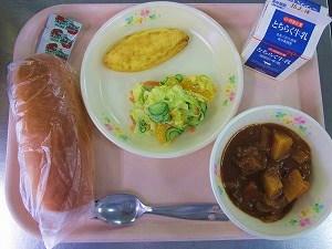 「コッペパン マーシャルビーンズ 牛乳 オムレツ れんこんサラダ サマーシチュー」です。