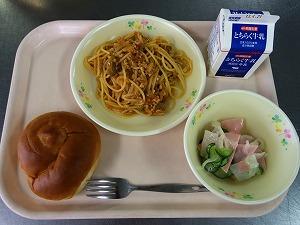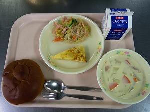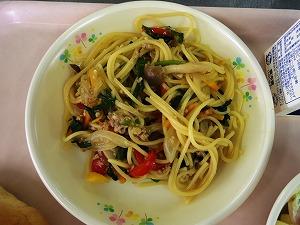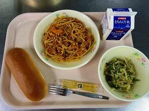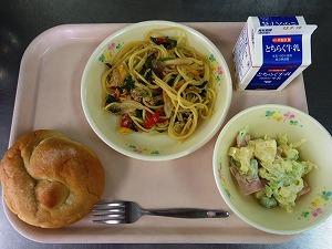 紅茶パン 牛乳 にら入りスパゲッティ ハム&チーズサラダ です。