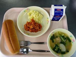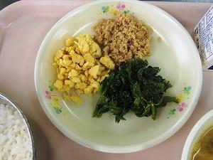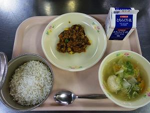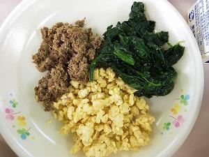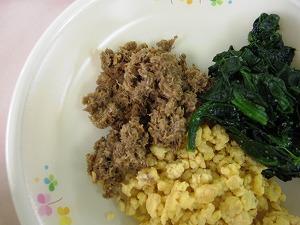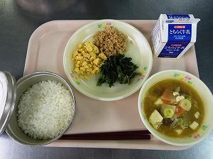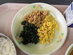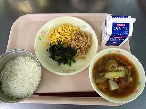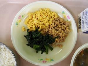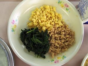 麦ご飯(三色丼) 牛乳 どさんこ汁 です。