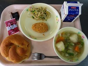 黒パン 牛乳 白身魚フライ コールスローサラダ ワンタンスープ です。