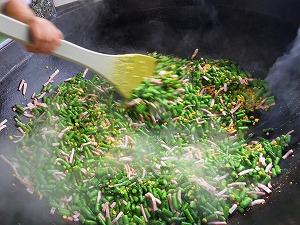 豚ひき肉を、オリーブオイルで炒め、にんにく、しょうが、豆板醤、野菜を加えて炒めたら、