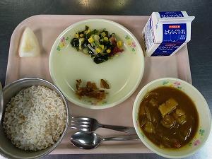 五穀ご飯 シーフードカレー 牛乳 福神漬け 海草サラダ 梨 です。