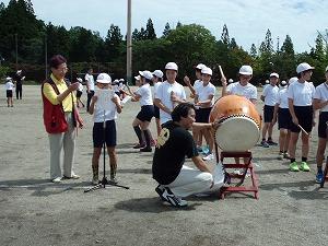 児童有志によるお囃子演奏には松本勲さんが,歌には四十物さんがついて