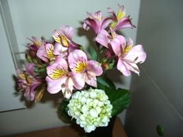 ゆりの白、キンセンカの黄色、そして、ケイトウの赤が華やかです。