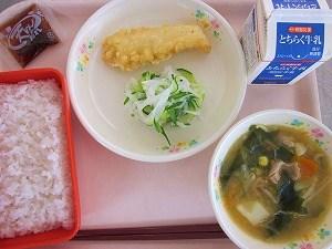 「イカ天丼 牛乳 磯香和え 味噌汁 グレープフルーツ」です。