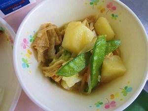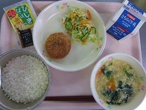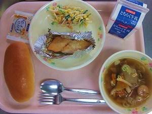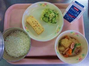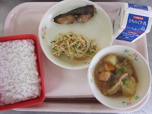 「ごはん 牛乳 とろあじねぎ塩焼き キムチ和え じゃがいものそぼろ煮」です。