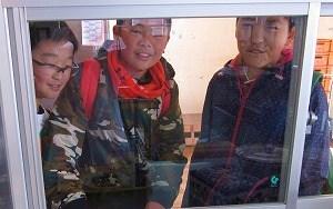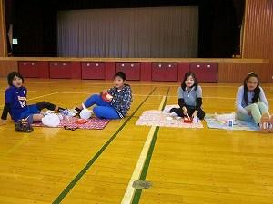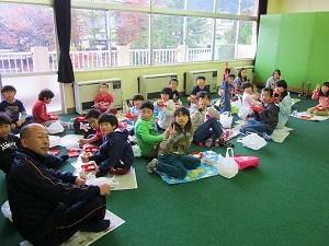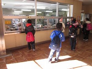 給食室前には、スケート教室から帰ってきた4年生が群がっていました