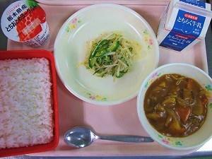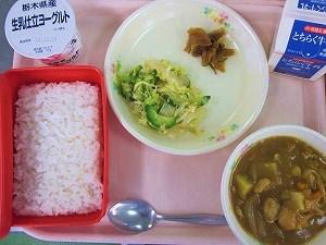 「ご飯 牛乳 チキンカレー 福神漬け こんにゃくサラダ 栃木県産ヨーグルト」です。