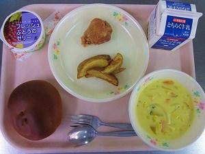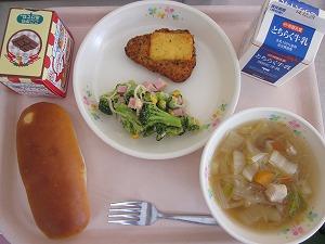 「紅茶パン 牛乳 チキンのオーブン焼き グリーンサラダ コーンスープ」です。