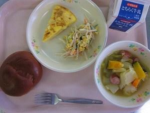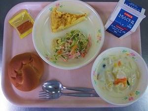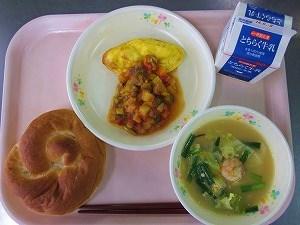 30日(金) 米粉パン 牛乳 オムレツ ラタトゥイユ エビとニラのピリ辛スープ