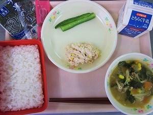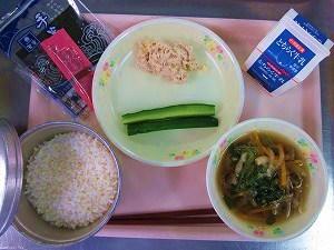 「手巻きご飯(ツナ・きゅうり・梅) 牛乳 どさんこ汁」です。