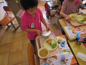 日光小は、おぼんには、お箸・おかず・汁物・デザートを乗せて配り、