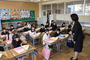1年生は担任の先生と一緒に教室で入学式に向けてあいさつなどの練習をしました。