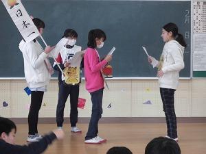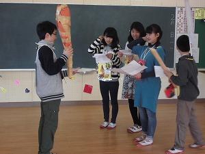『ももたろう』の話に登場する人物のせりふを英語で話し、かんたんな劇を発表しました。