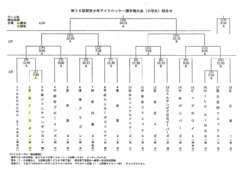 スポーツ少年団/公式試合のお知らせ 投稿日時 : 2011/01/01 職員室 カテゴリ:連絡事項 日光イースタンアイスホッケークラブ 公式試合のお知らせ ”第36回関東少年アイスホッケー選手権大会” 1回戦 対 千葉ジュニアペンギンス 会場: 日光霧降アイスアリーナ 日時: 1月8日(土) 7:45 組み合わせトーナメント表はこちらをクリック! ↓ 関東少年組み合わせ表.JPG ご都合のつく方は応援よろしくお願いします。 Tweet {{options.likeCount}} {{options.likeCount}}