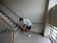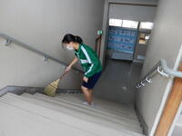 清掃の時間が十分とれない中、8月31日(火)朝少し早く登校していた2・3年の生徒が、3階から1階の中央・東・西階段をほうきできれいに掃いてくれました。