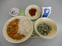 ・麦ご飯、夏野菜カレー、牛乳、こんにゃくサラダ、フローズンヨーグルト、ろばた漬け(※)