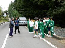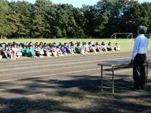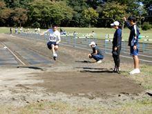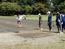 「新記録目指して頑張りましょう」   いました、落中生チーム。       1年男子、走幅跳。