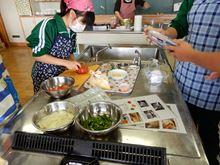 「よくこねてねー」   続いて、トッピングの材料ををカットします。 タマネギをすごいスピードでカットする