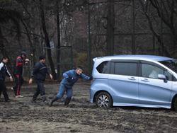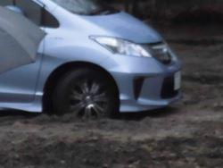 雨のためにスタックして動けなくなりました。 みんなで「せーーーの」 「それいけっ」やっと抜け出せました
