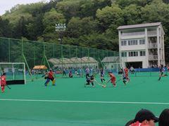今市青少年スポーツセンターホッケー場。男子、落合・大沢合同チーム。すごい迫力です。相手は川口。シュート決まりました。