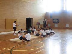 長座体前屈。 素晴らしい柔軟性です。 外では50m走 「よういドン」 ハンドボール投げ 「14mです」