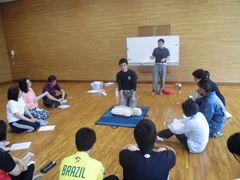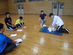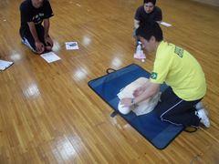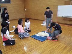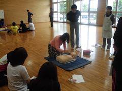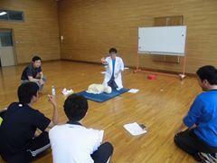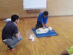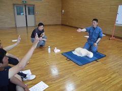 今市消防署から2名の救急救命士の 早速、心肺蘇生を練習します。 「祐輔さん、祐輔さん、聞こえますか」
