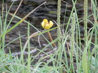 9月10日(金)の夕方、絶滅危惧種に指定されている「シモツケコオホネ」が咲く小代地区の用水路に行ってきました。今の時期は見頃を過ぎているのかもしれませんが、水面に黄色の可憐な花を見つけ、とても嬉しくなりました。