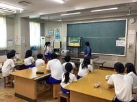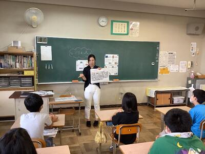 ボランティアの田中さん、大森さんにお越しいただき、「平和」について考えました。田中さんは平和記念式典に参加されており、式典の中では、広島県の子供代表が毎年、「平和への誓い」を述べているそうです。その動画を見せていただきました。友達のよいところを見つけること、みんなの笑顔のために自分の力を使うことなど、平和のためにできることはたくさんありますね。