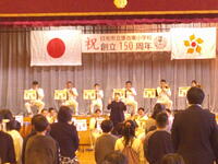 明治6年10月17日に小代知新舎として開校してから創立150周年を迎えたことを記念し、落合中学校体育館にて記念式典を開催いたしました。式典の第1部は学校運営協議会長、学校長、PTA会長、来賓の皆様からの挨拶が、厳粛な雰囲気の中行われました。また、6年生代表児童が創立150周年に対する決意と思いを発表し、児童が募集し決定した本校のキャラクター「おちとウッキー」がお披露目されました。