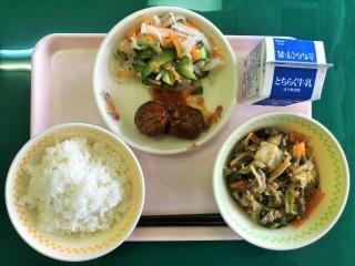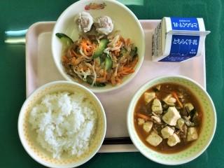 ・今日のメニューは、ご飯、牛乳、マーボー野菜、ポーク焼売、中華くらげあえ