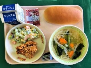 ・今日のメニューは、そぼろ丼、牛乳、五目みそ汁