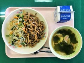 ・今日のメニューは、ビビンバ丼、牛乳、とうがんのスープ、ラ・フランスゼリー