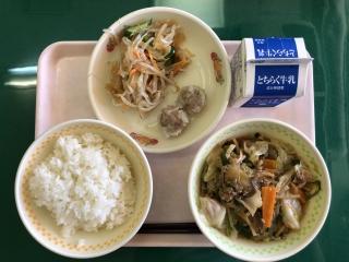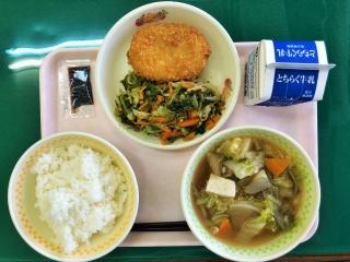 ・今日のメニューは、ご飯、牛乳、じゃがいもとキャベツの煮物、納豆、おひたし