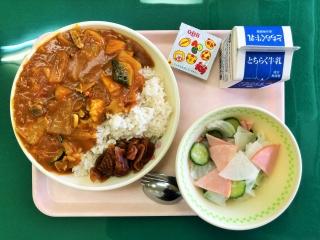 ・今日のメニューは、麦ご飯、牛乳、ポークカレー、ろばた漬け、海藻サラダ、とちおとめヨーグルト