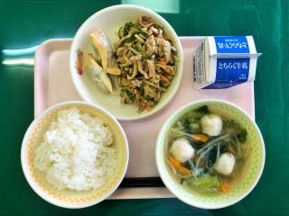 ・今日のメニューは、ご飯、牛乳、チンジャオロースー、えびだんごスープ、やきぎょうざ
