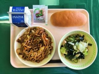 ・今日のメニューは、コッペパン、牛乳、とちおとめジャム、焼きそば、ツナサラダ
