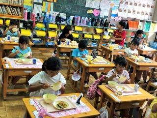 ・今日のメニューは、ご飯、牛乳、さんま蒲焼き、ゴーヤチャンプルー、イナムドゥチ(沖縄の郷土料理。お祝い事のときに食べるそうです)