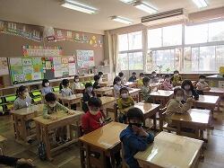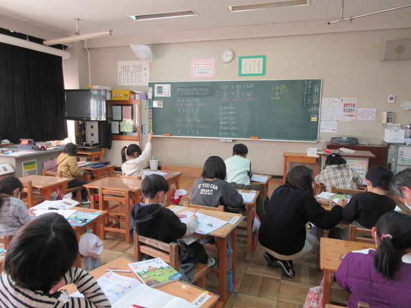 1年生は姿勢よくひらがなの学習です。 2年生は音楽、拍を感じながら歌っています。