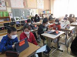 今日は4年生の国語の授業を紹介します。「調べたことをわかりやすく伝える」をめあてに自分で調べたことの報告書を作成する学習です。タブレットの操作も上達し、調べ学習を進めていました。