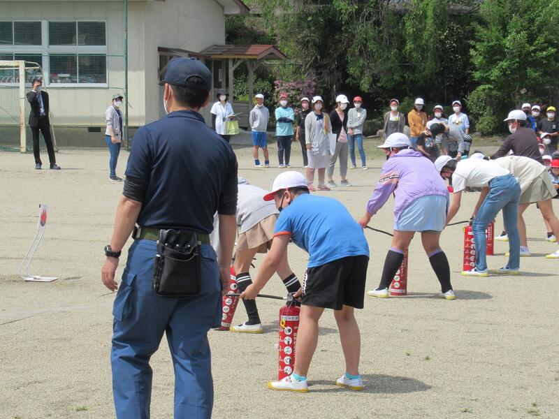 校庭に避難した後は、消火器の使い方を学びました。先生方の次は6年生!火をよく狙って、上手に使うことができました。