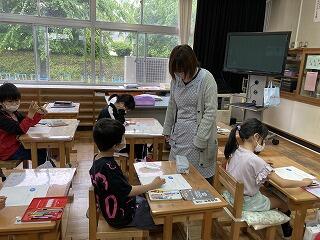 1年生は算数の授業です。1位数+1位数の足し算です。ノートの取り方も上手になってきました。