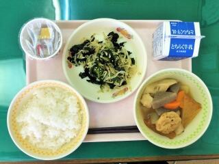 ・今日のメニューは、ご飯、牛乳、さわら西京焼き、切り干し大根の煮物、むらくも汁