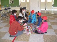 2月19日に、1年生は、明神保育園の年長さんを学校に招いて、交流会を実施しました。1年生がグループごとに作った迷路や割り箸鉄砲、魚釣りゲームなどで遊んでもらい、その後1年生の案内で学校探検もしました。